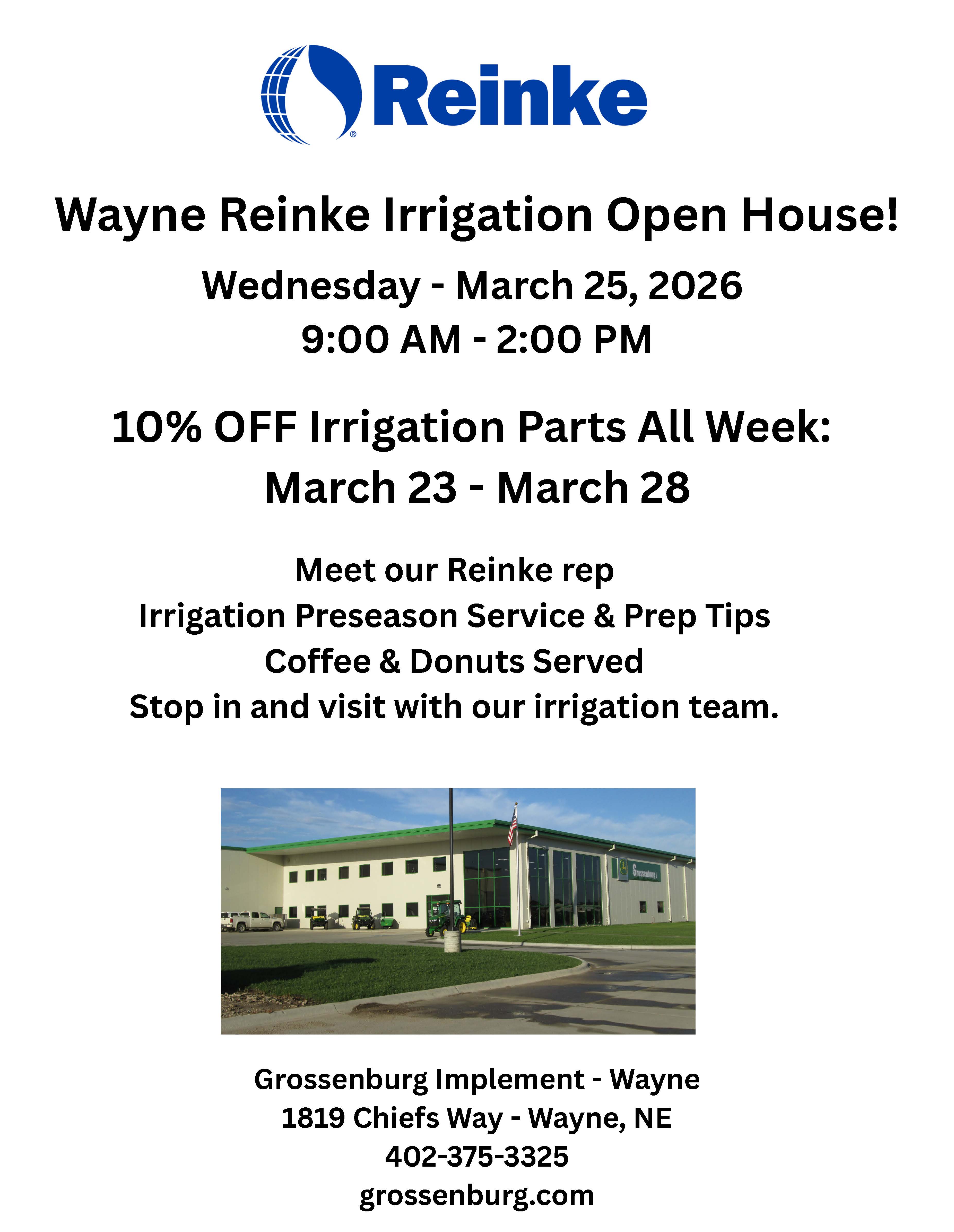 Come to our Open House in Wayne, NE to see what is new from Reinke for 2026.We will have our Reinke Rep on site to answer any of your questions you may have.Plus ask our Parts Dept about Exclusive Reinke Parts Discounts for this Week!