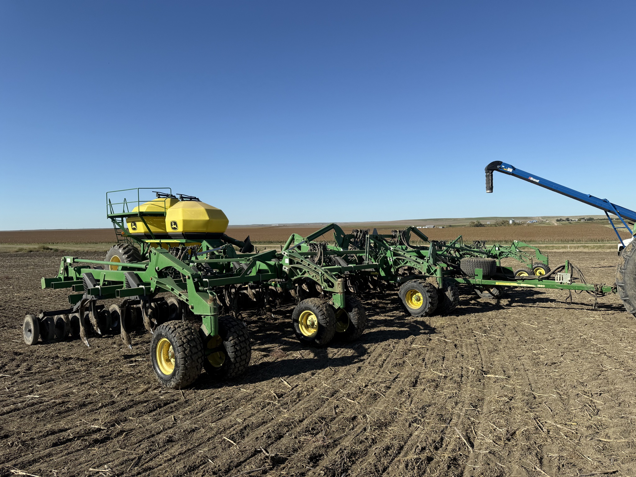 Consignment. John Deere 2010 1830 Hoe Drill, 57′ 5 Section, 10″ spacing. Shoot: Single Shoot 550 Lb. Opener on Four Ranks 4 x 21 In. Semi-Pneumatic Press Wheels Dual Main & Wing Caster Wheels, 31Lx13.5Mechanical Depth Control Single Shoot Air Package for 350 Bushel Tow-Behind Cart, two tank, ground driven, Intelligent Ag Blockage System.