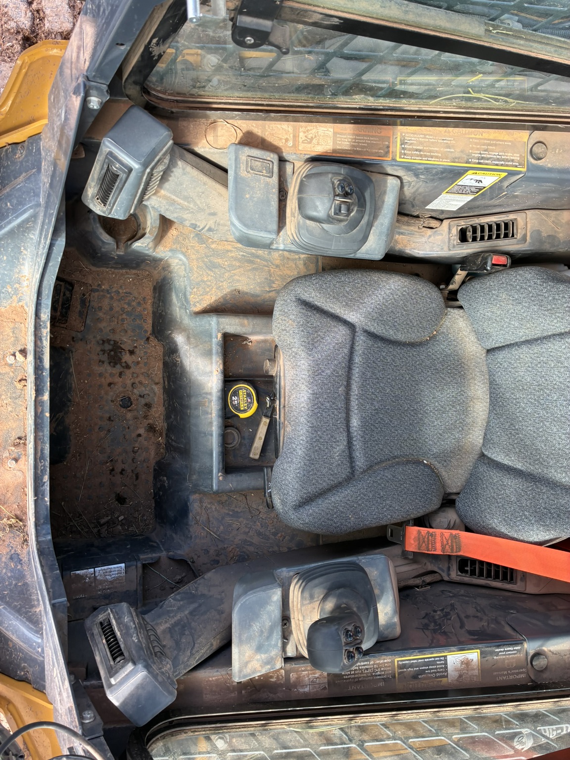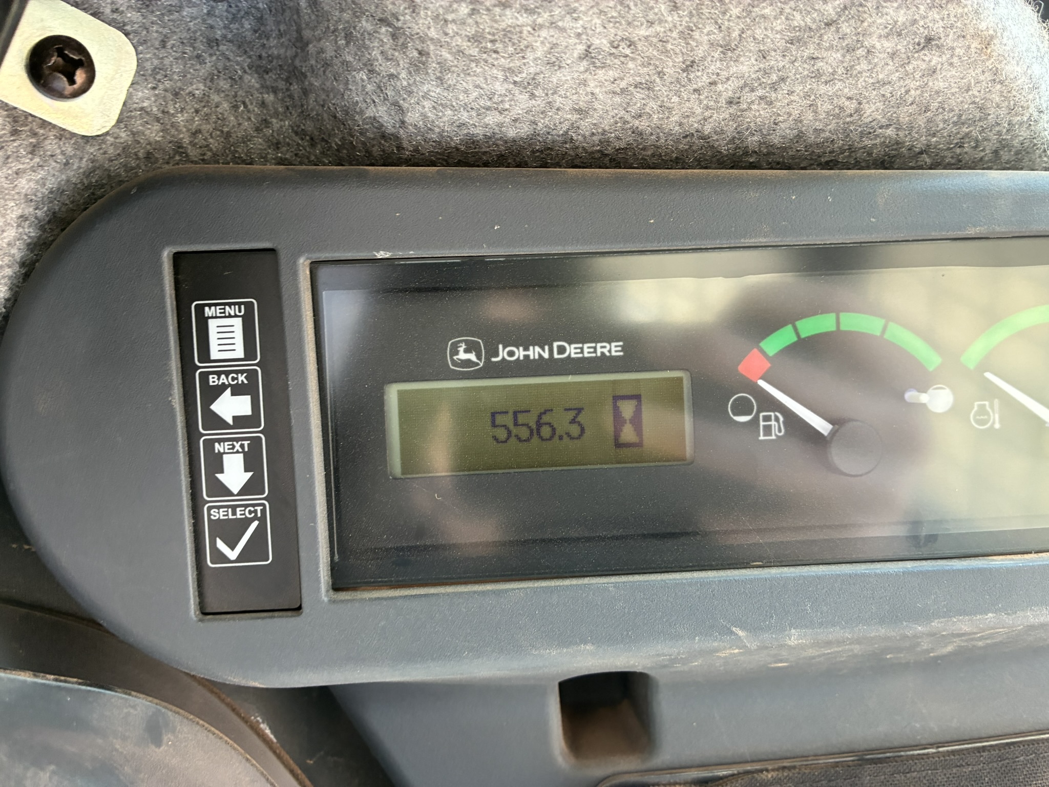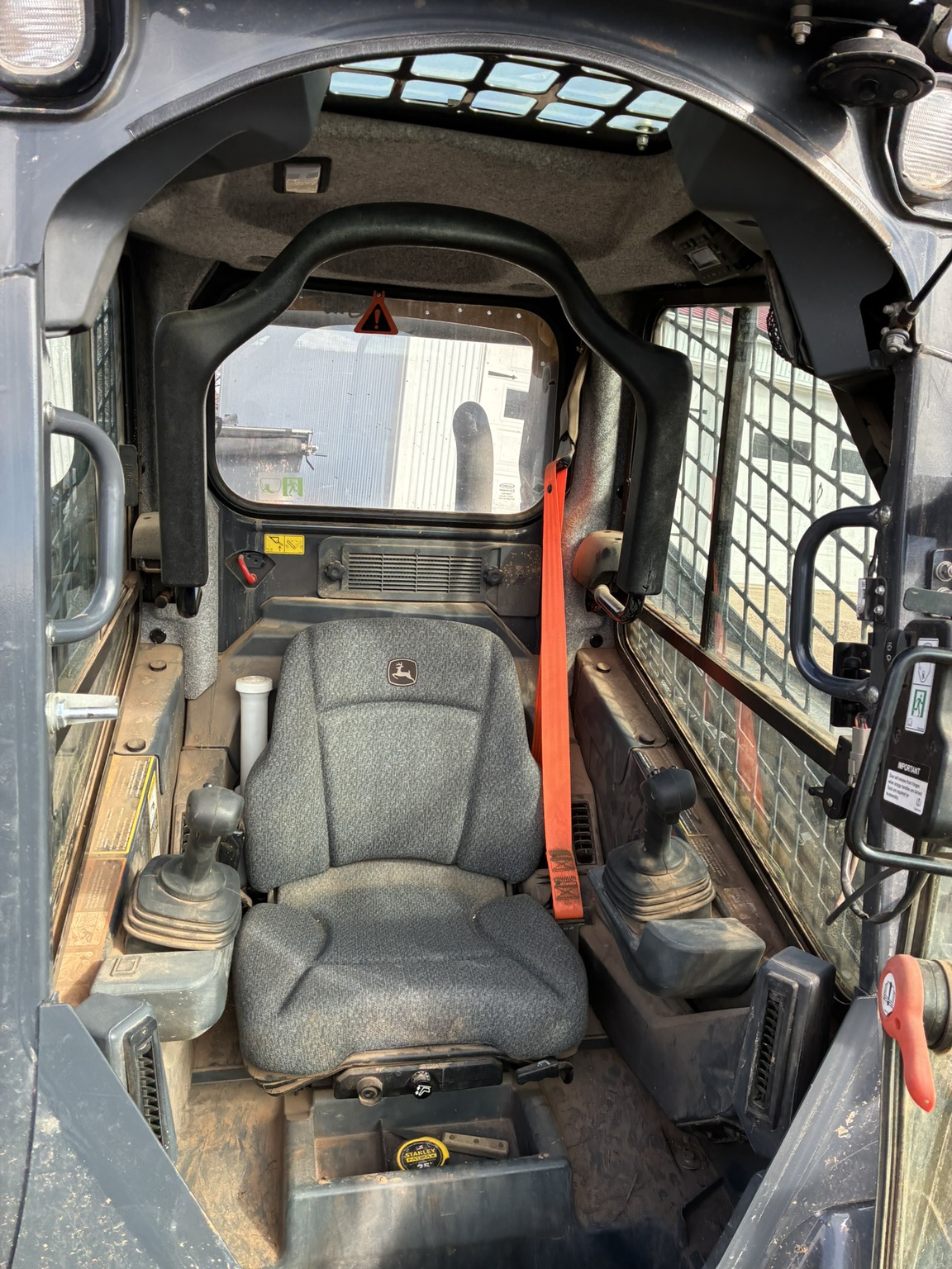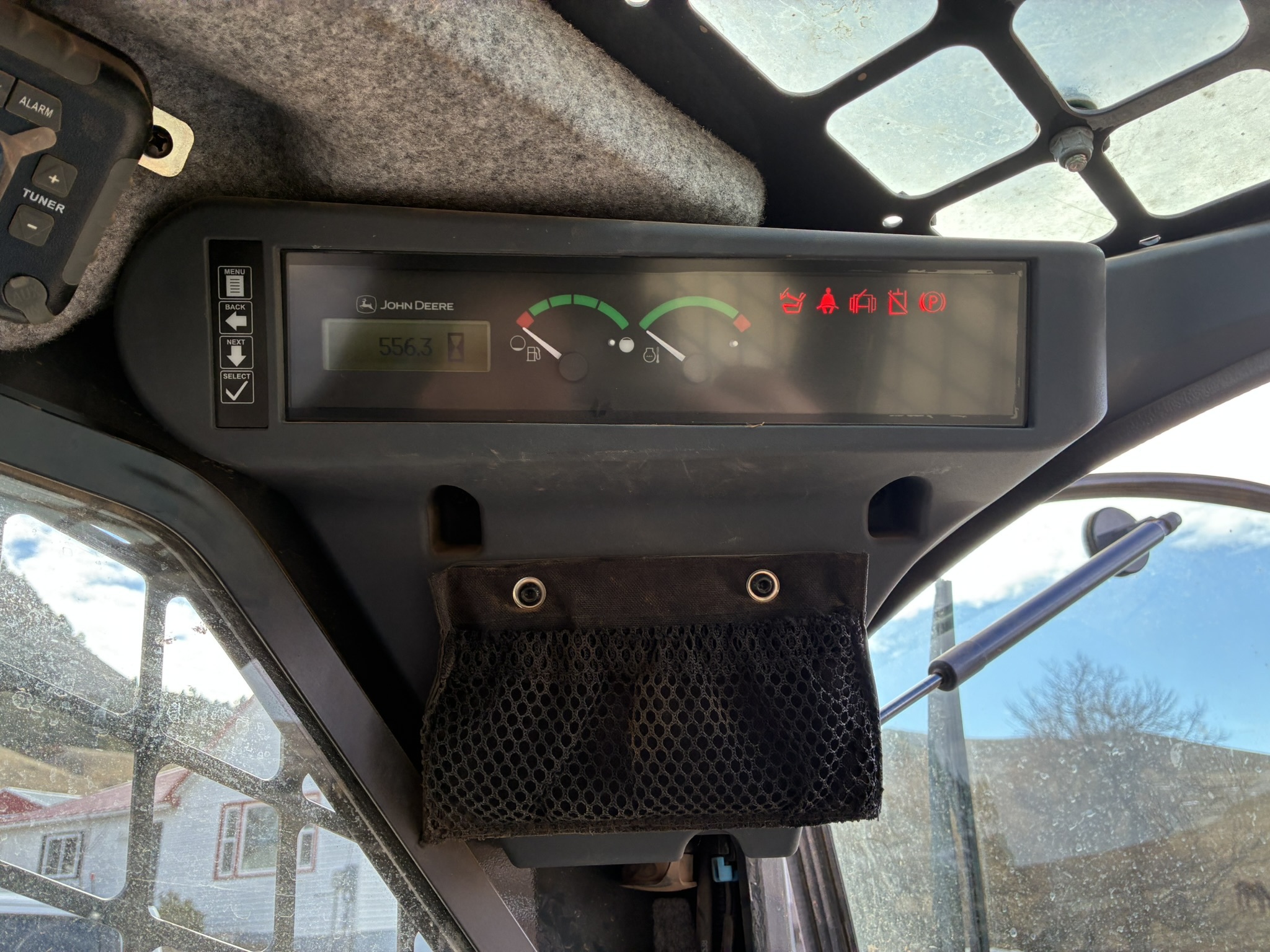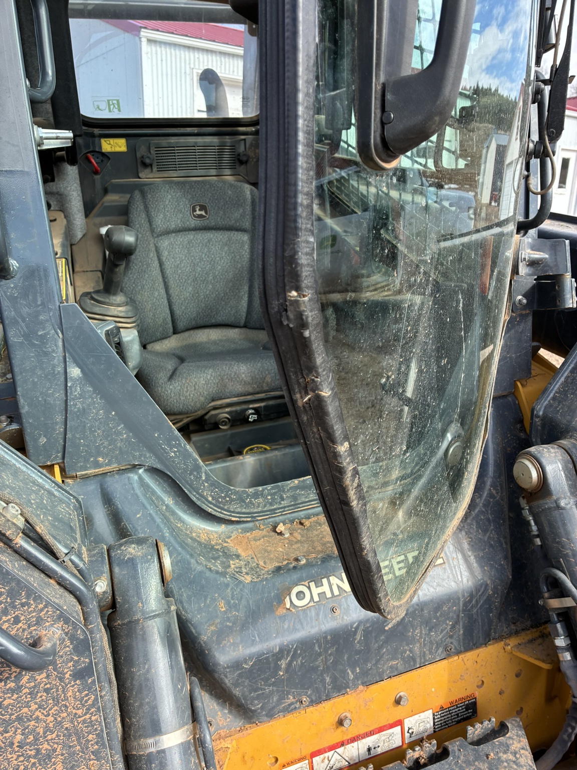 CLEAN lease return with only ___ hours, NEW John Deere wide Zig-Zag tracks, cab/heat/ac, speed, self-leveling, air ride heated seat, joystick controls with attachment control, cold start package, radio, 78″ bucket, and 3 sets of counterweights.
