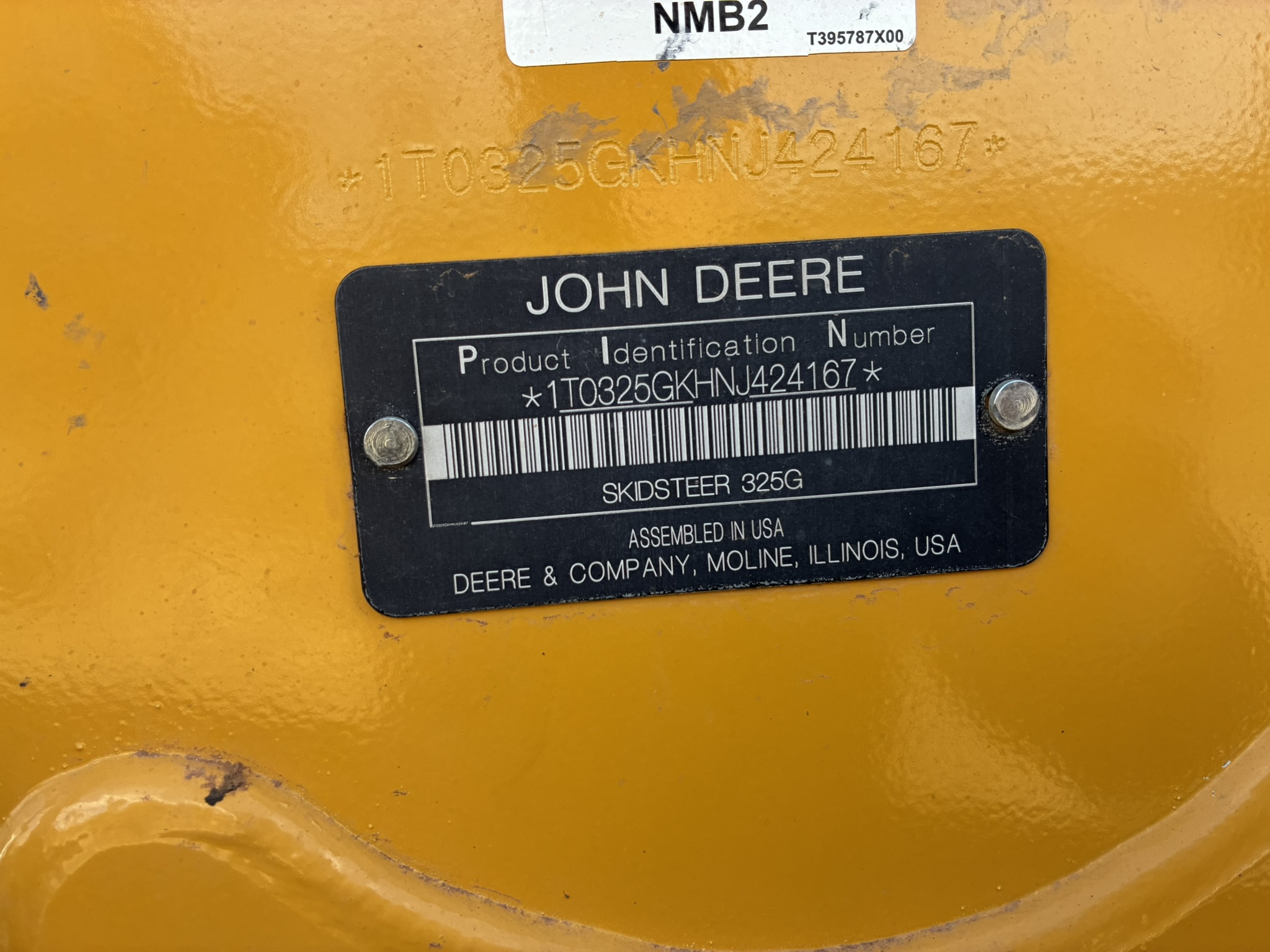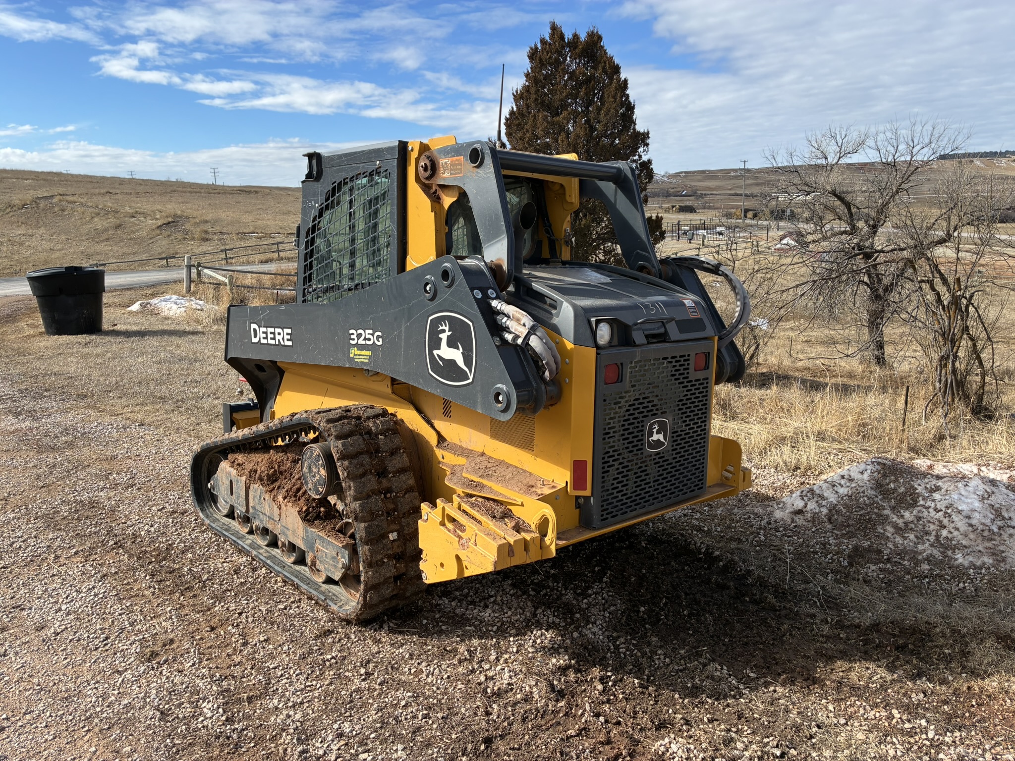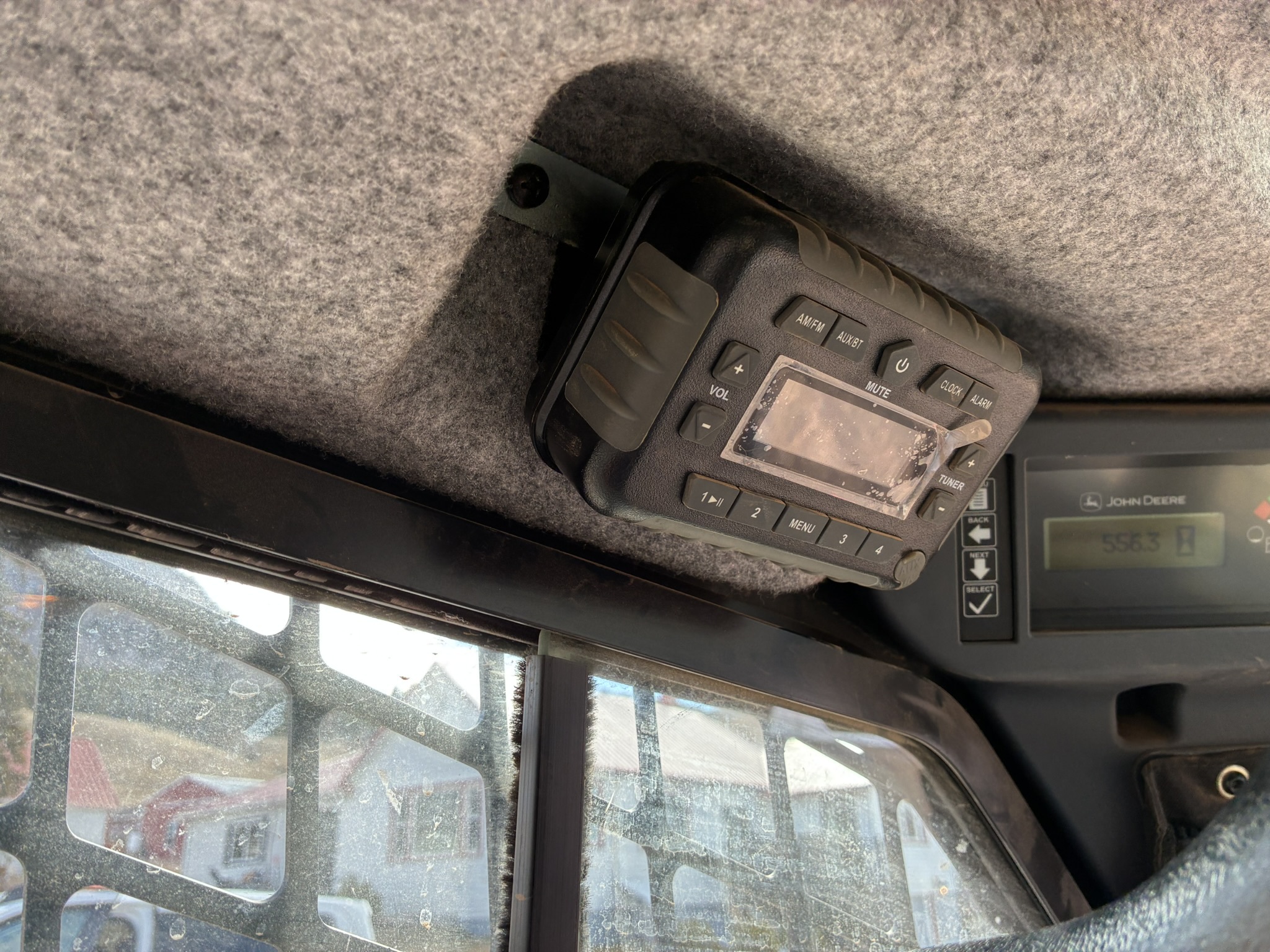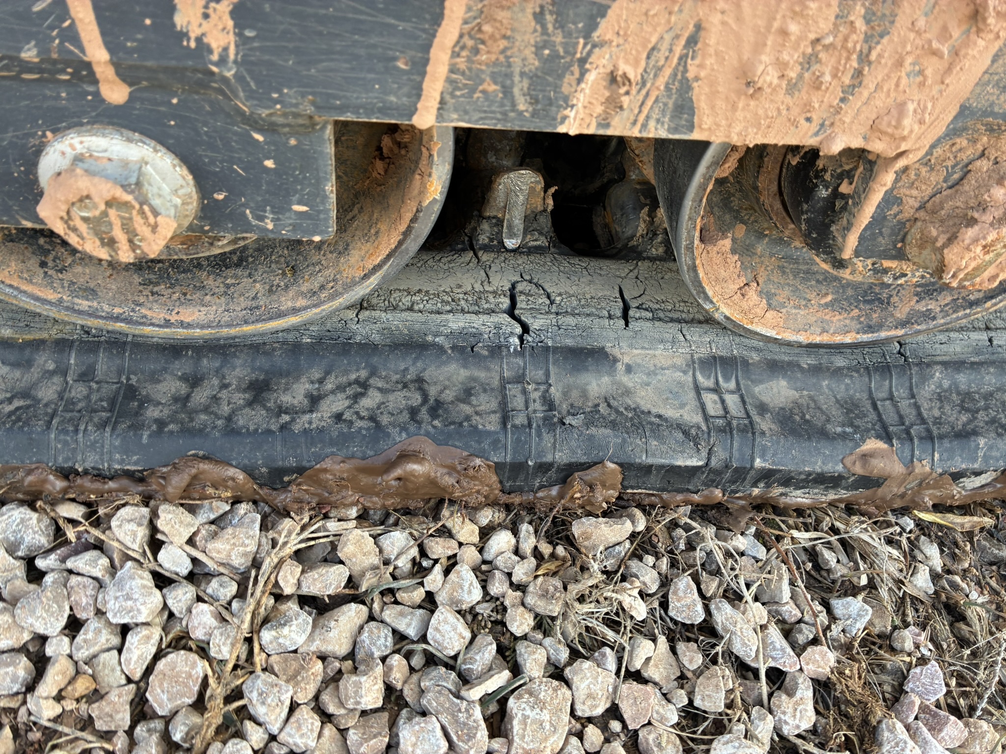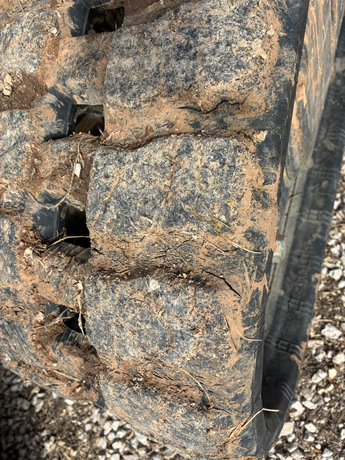 CLEAN lease return with only ___ hours, NEW John Deere wide Zig-Zag tracks, cab/heat/ac, speed, self-leveling, air ride heated seat, joystick controls with attachment control, cold start package, radio, 78″ bucket, and 3 sets of counterweights.