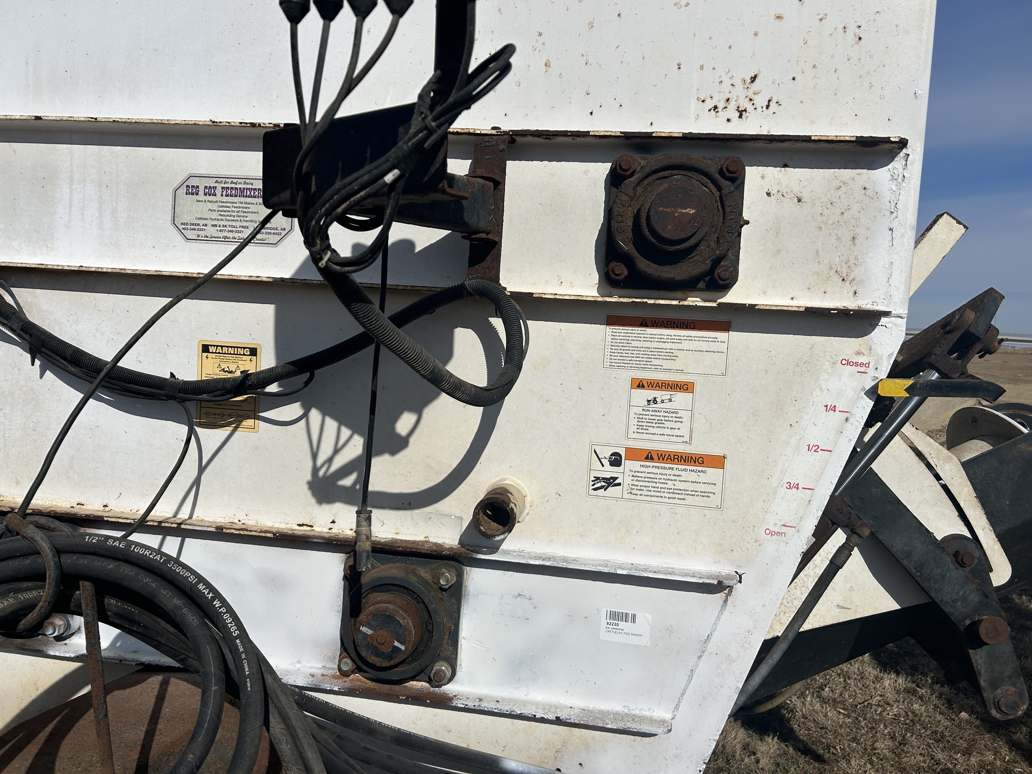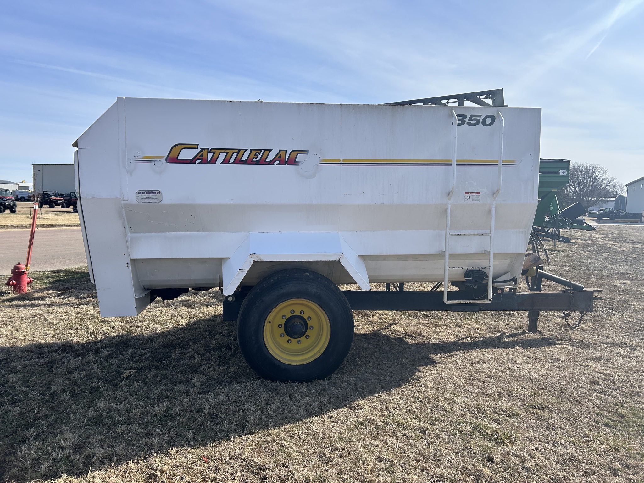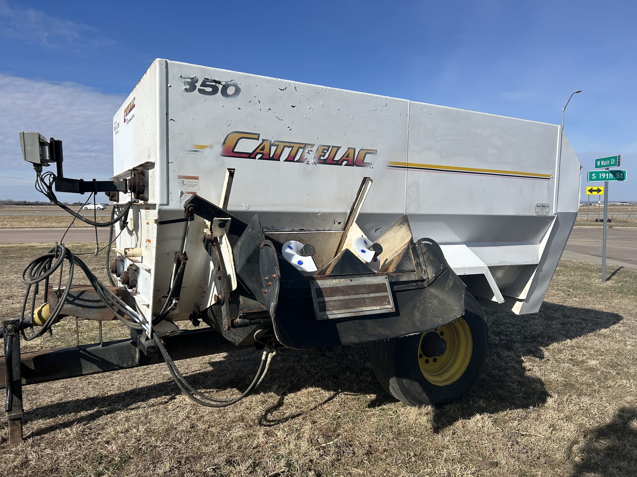Cattlelac 350 feed wagon, 4 auger mixer with 2 auger LH discharge. Magnet on discharge, scale, good tires on single axle, 350 cu/ft capacity. One owner feed wagon that is well maintained and kept in heated shop. Good starter wagon or backup unit at a low price!