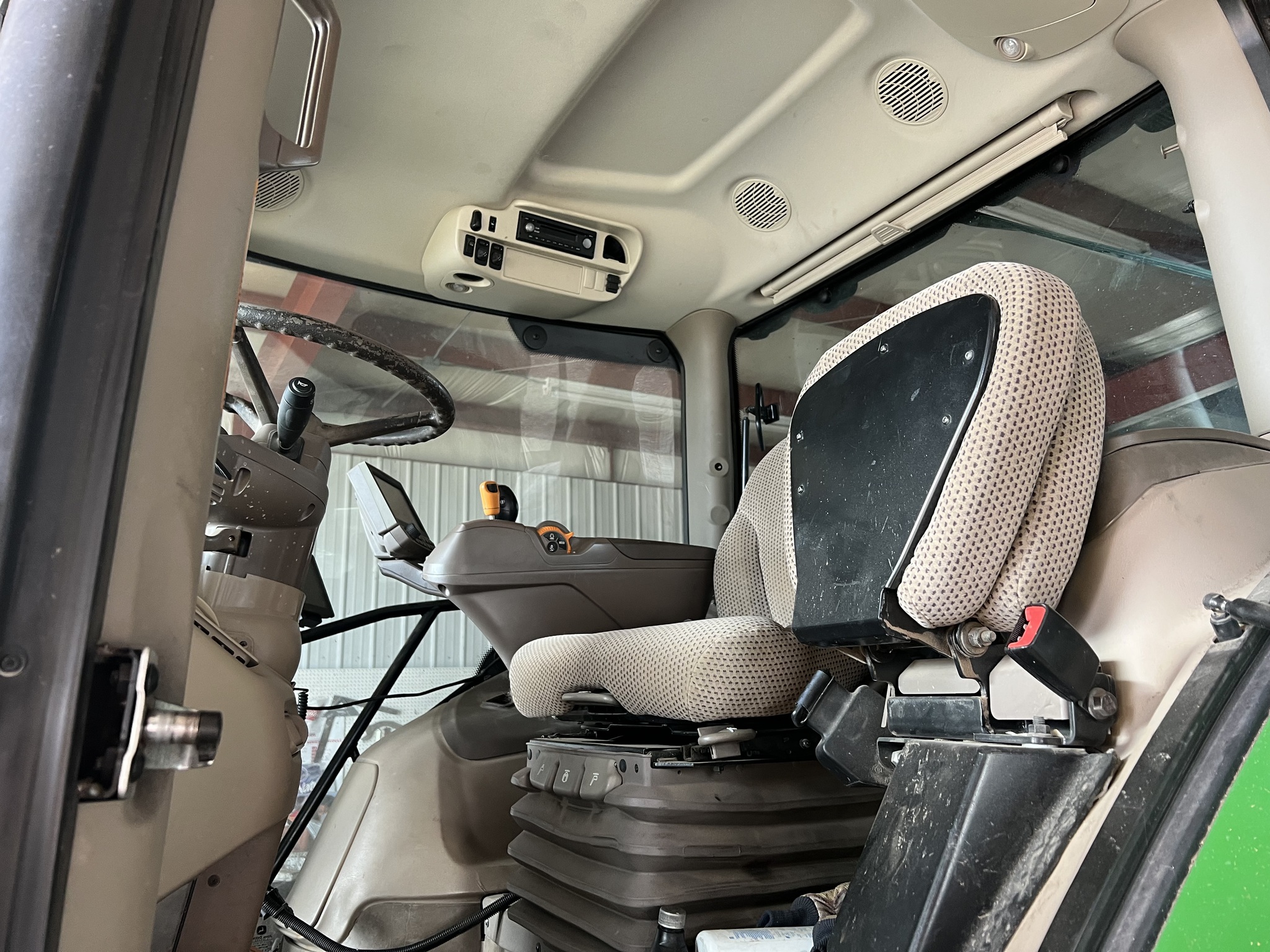 Nicely equipped 2 owner tractor that has been used on haying operations its whole life (baling and stacking mostly, some on bale processor). Equipped with IVT transmission w/ LH reverser, front suspension, premium cab and light package, 3 rear electronic SCV’s, and electric joystick. Also includes 640R loader w/ 8′ bucket and 5-tine grapple. This tractor will be serviced and ready to roll. **Not available till May 2026 when customers new one gets in**