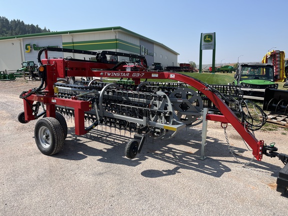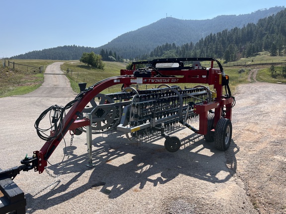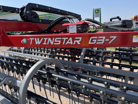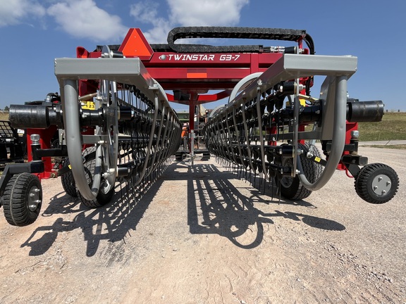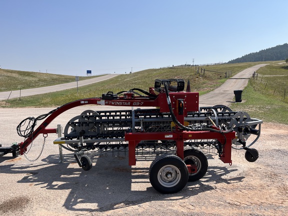 DEMO LIKE NEW Twinstar 2030 G3-7, 7 bar hydraulic rake, with optional front and rear torsion suspension gauge wheels. Standard options include torsion suspended baskets, HD basket drive motors, angle gauges and telescoping gauges to help you find consistently set raking and windrow width. Operate left and right hand sides independently for the ability to roll one windrow or adjust a basket while raking. Has been demo'd on about 40 acres and will sell with warranty.