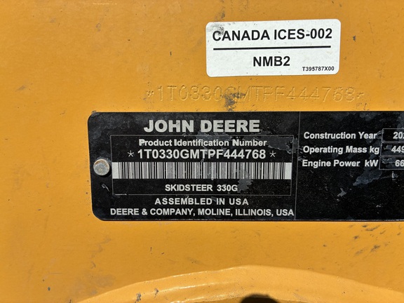 2023 330G skid loader. 2 Speed High flow hydraulics. rear view camera. Air ride vinal seat. Full cab with heat and air. Three counter weights per side. 84in high volume bucket. Power quick attach. 14X17.5 button tires. Heavy duty rear grill. Loaded up unit with just over 1000 hours.