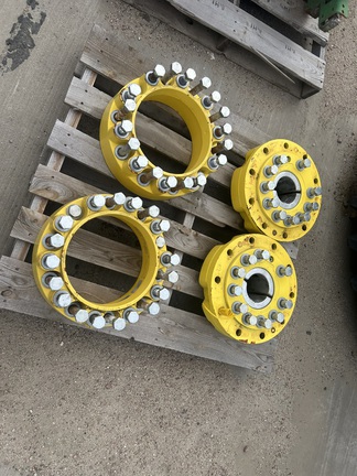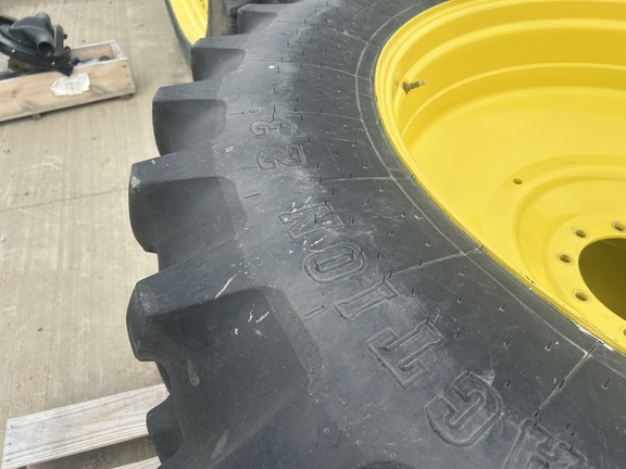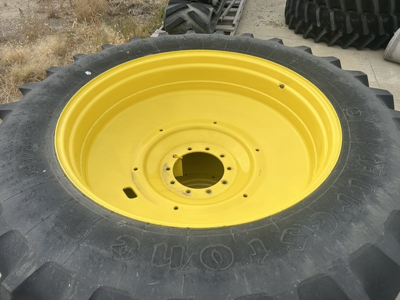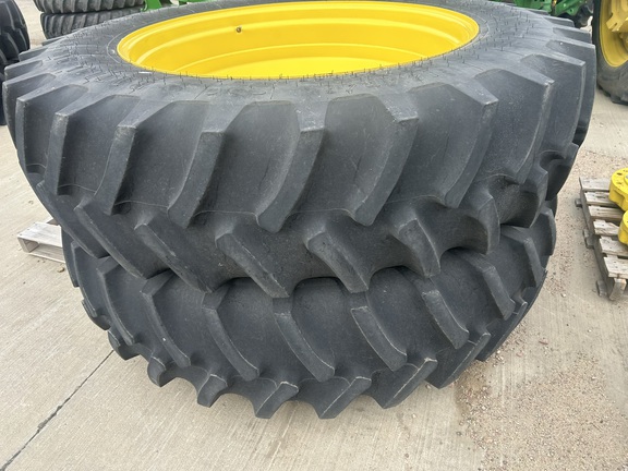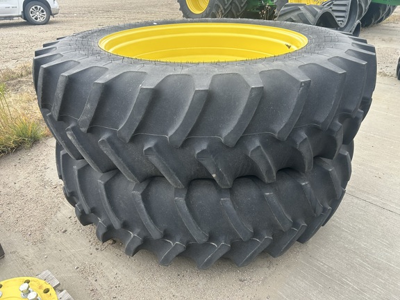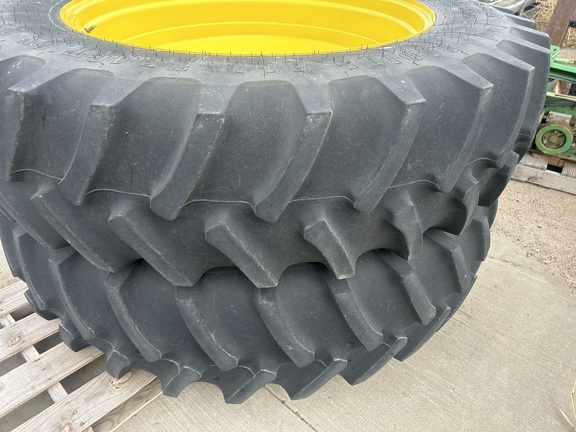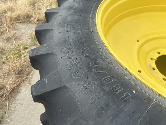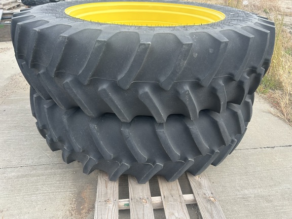 Used, roughly 75% tread. Firestone 23 deg 480-80R46 duals and hub. Came off large frame 6 series JD tractor.